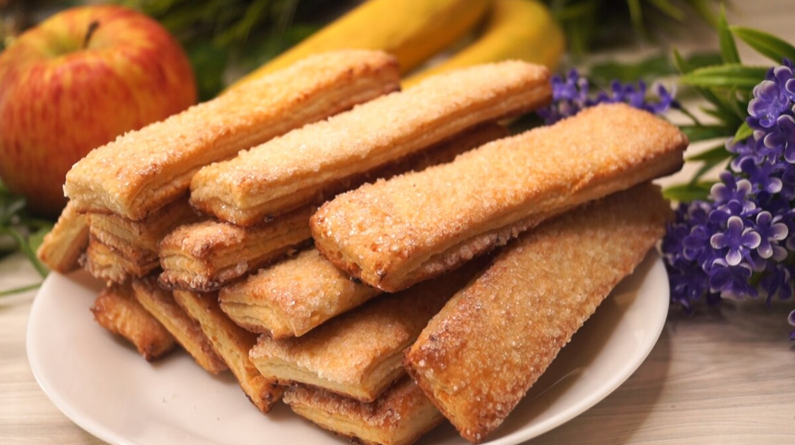 7. Выложить подготовленные кусочки на противень, выстланный пергаментной бумагой, и выпекать в разогретой до 210 градусов духовке в течение 10-15 минут. Печенье должно стать золотистым и хрустящим снаружи, а внутри — слоистым.