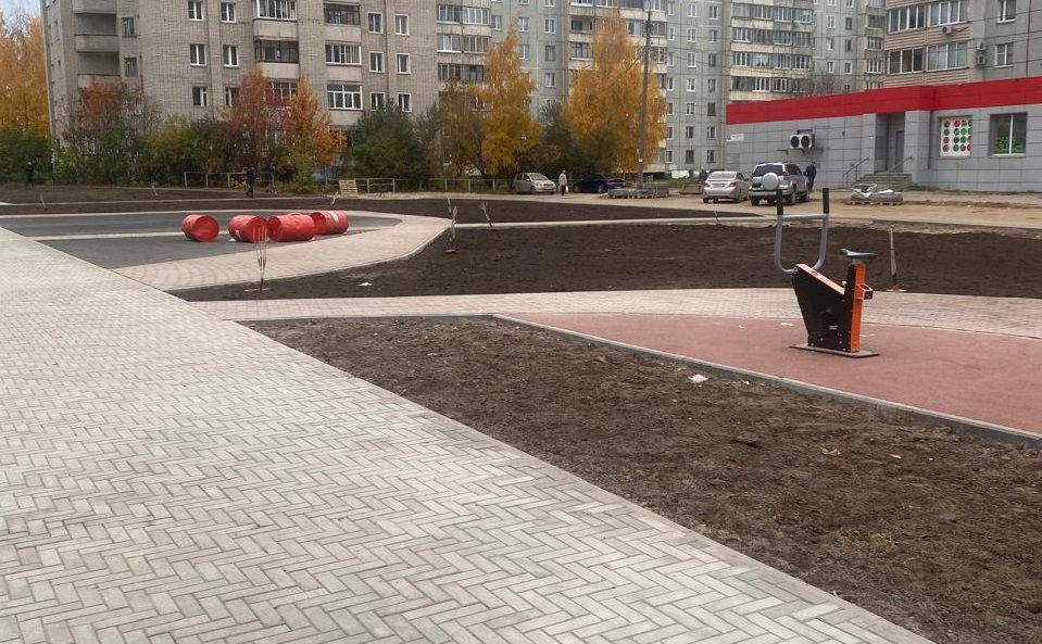 Подрядчик уже выполнил значительную часть работ: оборудовал тротуары, уложил резиновое покрытие на игровых зонах, провел освещение и подготовил грунт для будущих зеленых насаждений. Сейчас ведется монтаж малых архитектурных форм.