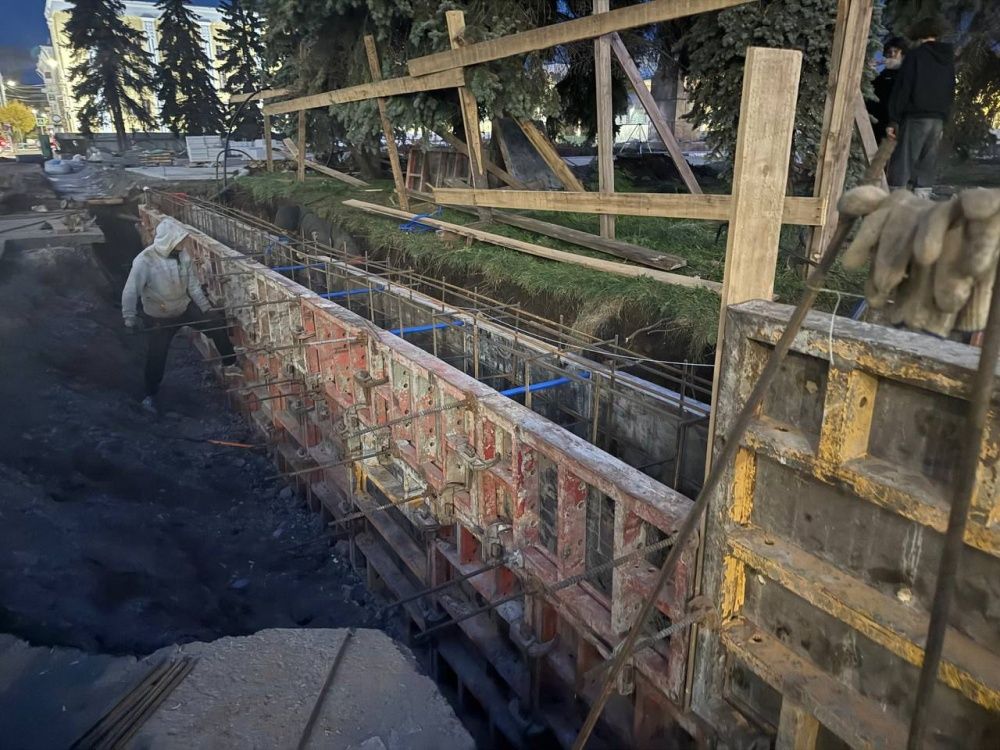 Сейчас рабочие выполняют монтаж опалубки, вскоре будет завершена заливка подпорной стенки. На других участках ведется укладка гранита. Продолжается формирование лестничных маршей и установка бордюра на цветнике.
