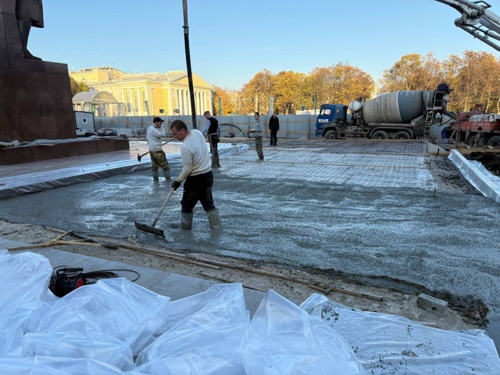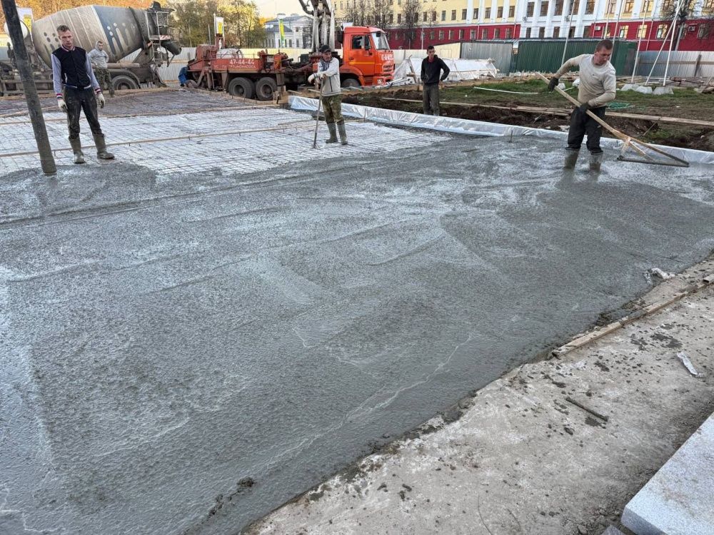 У памятника В. И. Ленину на Театральной площади в Кирове начали укладывать гранит.