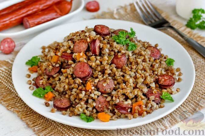 - Гречка с копчеными колбасками: идеально подается с луком и морковью. Обжаренные ингредиенты соединяются с гречкой и варятся, создавая насыщенное блюдо, которое понравится всем любителям копченостей.