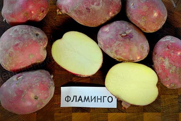 Клубни сорта Фламинго характеризуются крупными удлиненно-овальными формами, с розовой кожурой и белой или слегка кремовой мякотью. Вес одного клубня варьируется от 100 до 140 г. Вкус этих клубней восхитителен, что делает их отличным выбором для самых разнообразных кулинарных шедевров: от запеканок до картофельного пюре. Содержание крахмала достигает 14,4%, что придает особую текстуру и нежность готовому блюду.