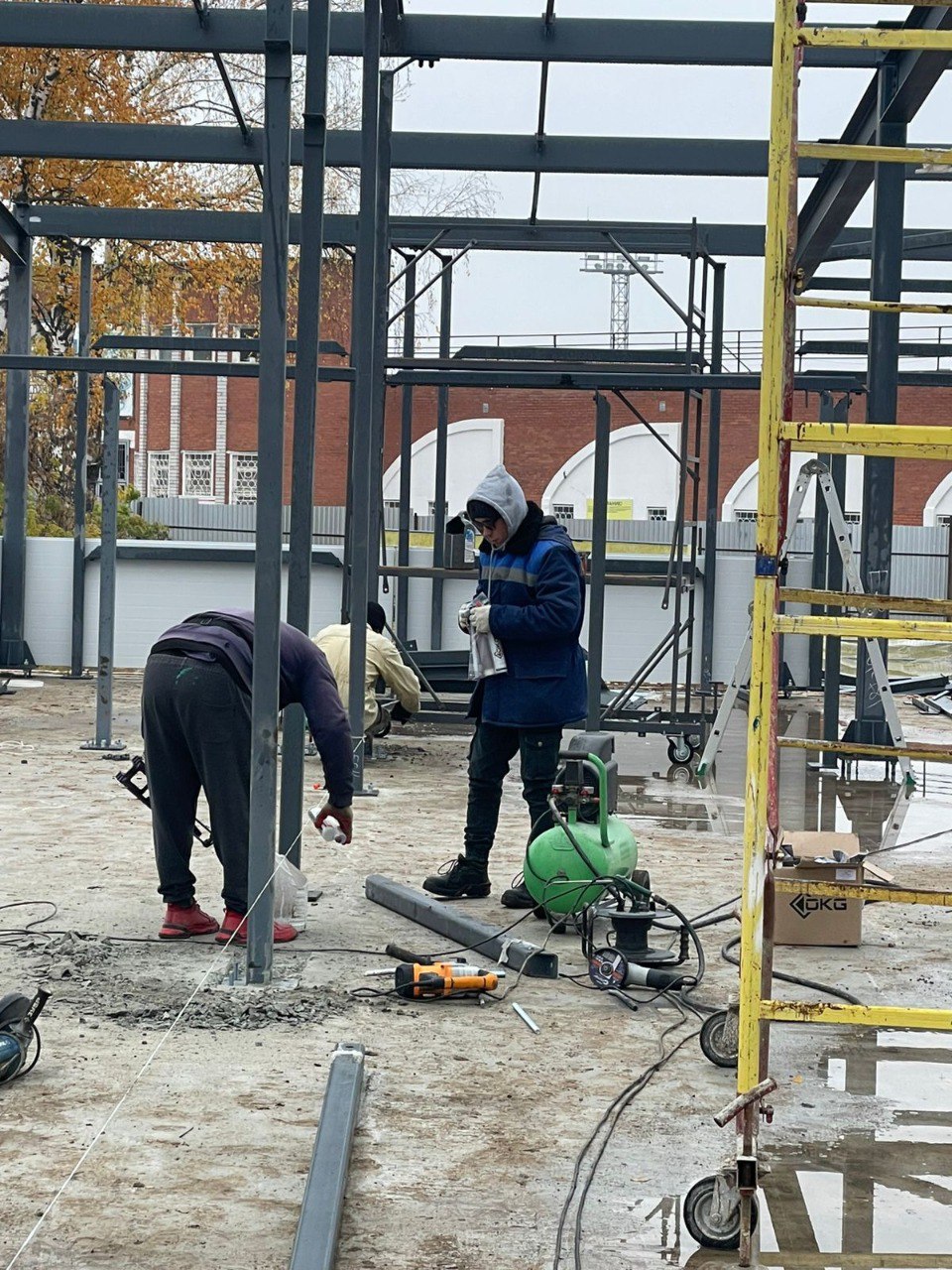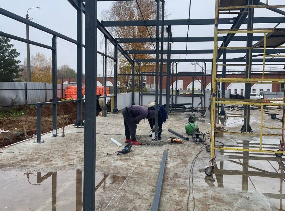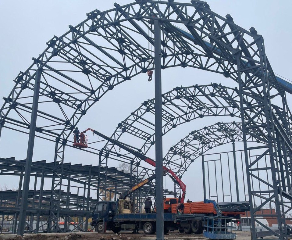 Сейчас на объекте проводятся сварочные работы, смонтированы три несущие арки.