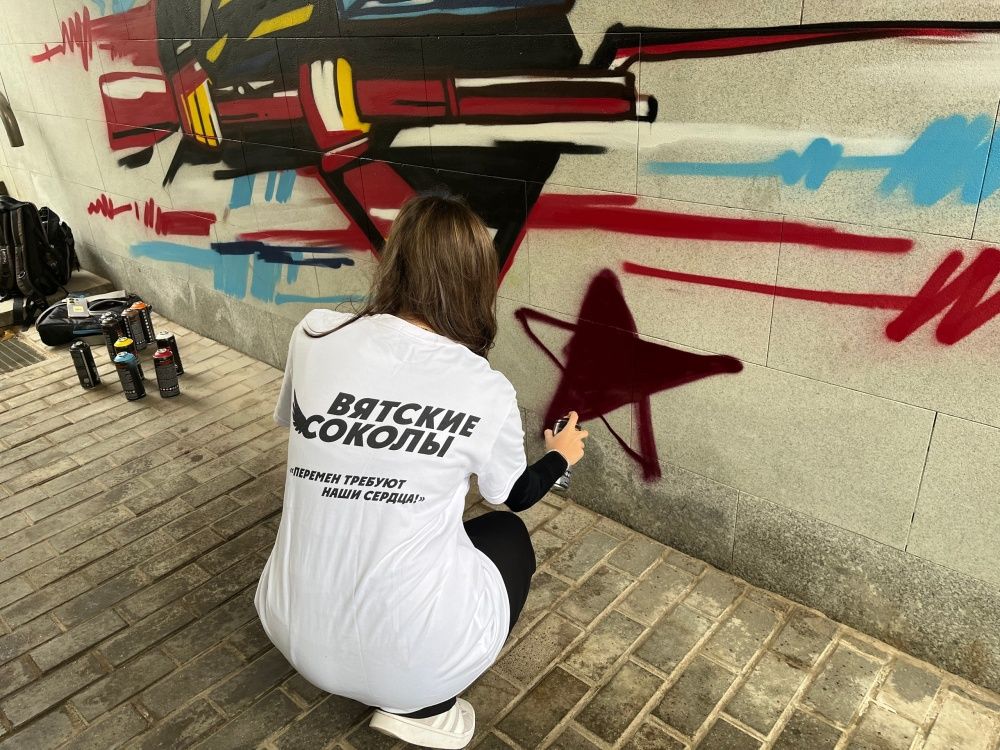 На стенах подземки у ЦУМа появились патриотические рисунки. Они созданы по эскизу победительницы муниципального конкурса «Киров – кузница героев» Фриды Саакян (наставник Антон Калинин).