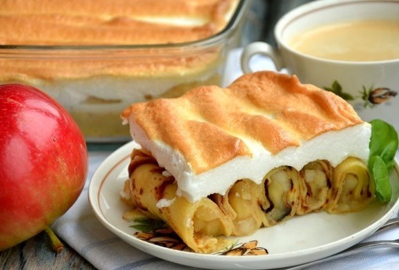 Теперь готовые блины наполняются яблочной начинкой, сворачиваясь в рулеты, которые выкладываются в смазанную маслом форму. Для меренги холодные белки взбиваются до крепкой пенки с сахаром и равномерно распределяются поверх рулетов. Затем соложеники ставятся в заранее разогретую духовку до 180 градусов и запекаются в течение 15 минут.