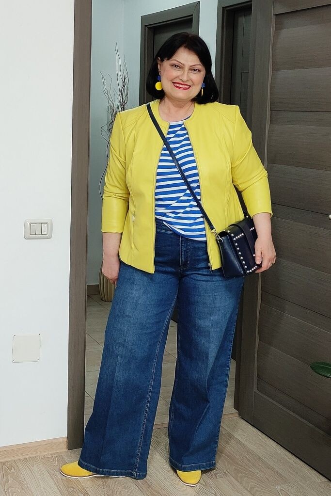 - Темно-синие джинсы: Отличный выбор для женщин любой фигуры. Они легко маскируют недостатки и в сочетании с короткой "тельняшкой" и яркой желтой курткой создают эффектный наряд. Не забудьте добавить стильные серьги и сумочку через плечо для завершения образа.