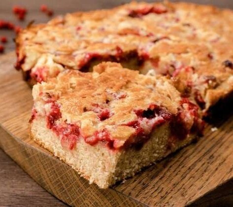 Готовый пирог выходит из духовки, и на его горячую поверхность равномерным слоем укладывается миндальный крем. Дальше его отправляют обратно в духовку на 15 минут. Когда ароматный пирог готов, его вынимают, оставляют остывать на 20 минут, а затем нарезают на порционные кусочки. Наслаждайтесь сладким лакомством вместе с любимым чаем или кофе!