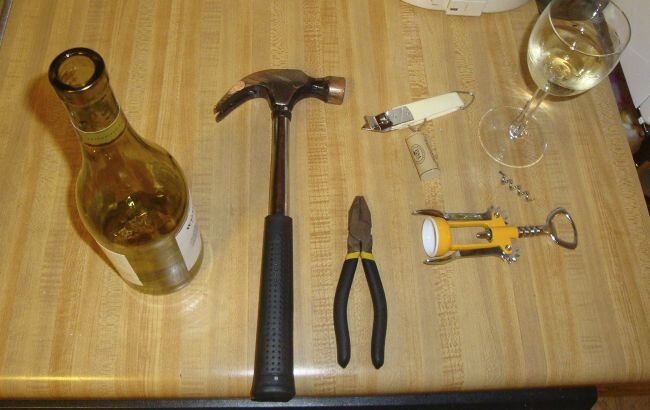 Не будет лишним и метод с ножницами: важно осторожно ввести одно лезвие в пробку и, поворачивая ручки, тянуть вверх. Более трудоемкий вариант — длинный винт, отвертка и молоток. Закрутите винт в пробку, оставив около двух сантиметров, и поднимайте его задней частью молотка.