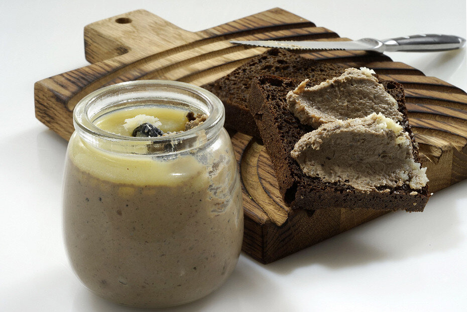 Перелить получившийся паштет в форму и залить растопленным смальцем или топлёным маслом. Украшение — важный момент: сверху можно положить чернослив. После этого убрать закуску в холодильник минимум на 4 часа для застывания.