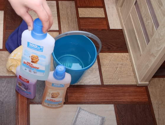 - Полы: Разведите 2 колпачка в ведре воды для общей уборки. Для особых загрязнений, как около плиты, используйте концентрат, который достаточно нанести на губку и потереть.