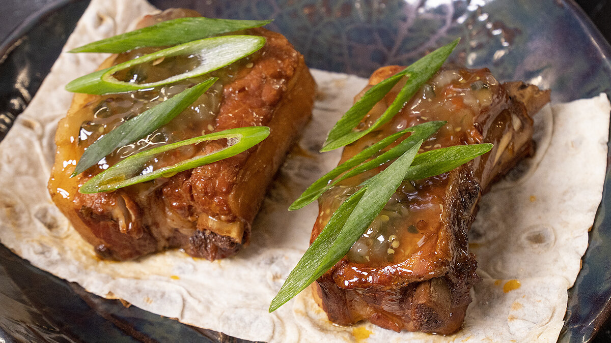 Выложите готовые ребра на лаваш, щедро посыпьте мелко нарезанным зеленым луком и полейте огуречным соусом релиш. Это простое, но эффектное блюдо обязательно впечатлит ваших близких и гостей.