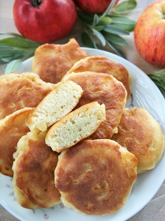 Яблоки, нарезанные кубиками, добавляют тесту не только разнообразия во вкусе, но и увлажняют его. Для достижения оптимального результата, тесту следует дать время постоять минут 10-15 перед жаркой, чтобы клейковина могла набухнуть.