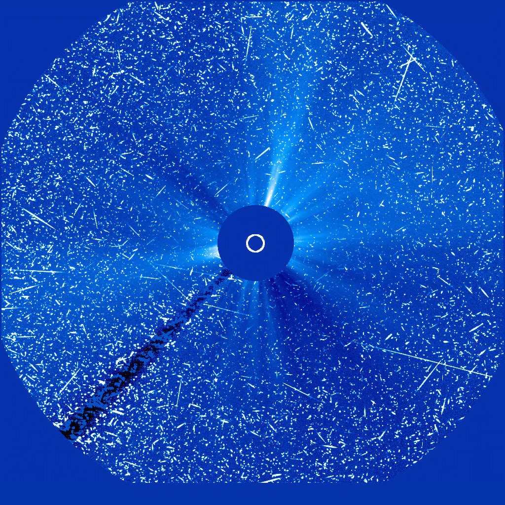Находящийся на большом удалении от Земли, вне защитного действия магнитосферы, космический аппарат SOHO, фактически не предоставляет в данный момент данных о Солнце, так как детекторы телескопов полностью засыпаны следами от бьющих по ним солнечных заряженных частиц (фото с синим фоном).