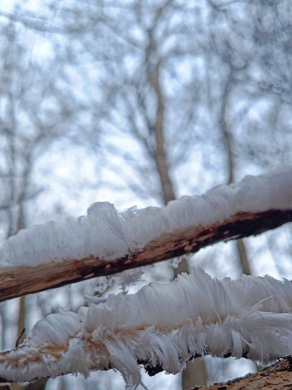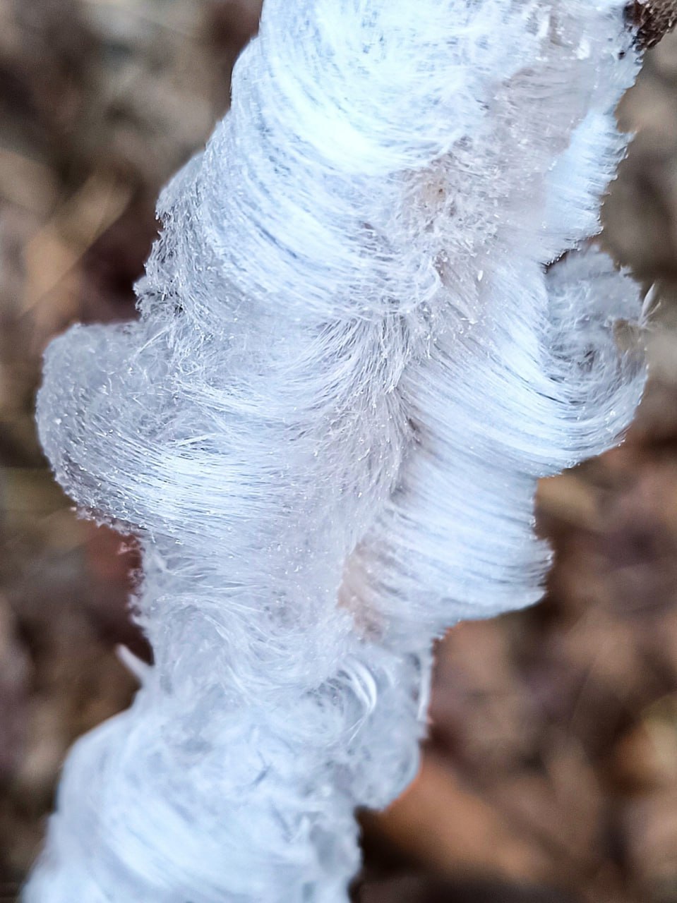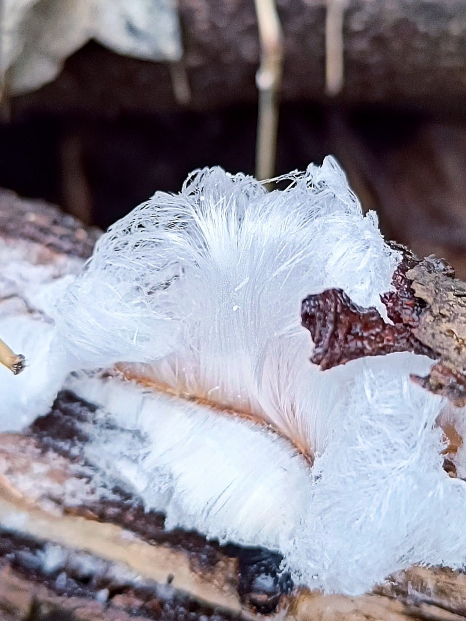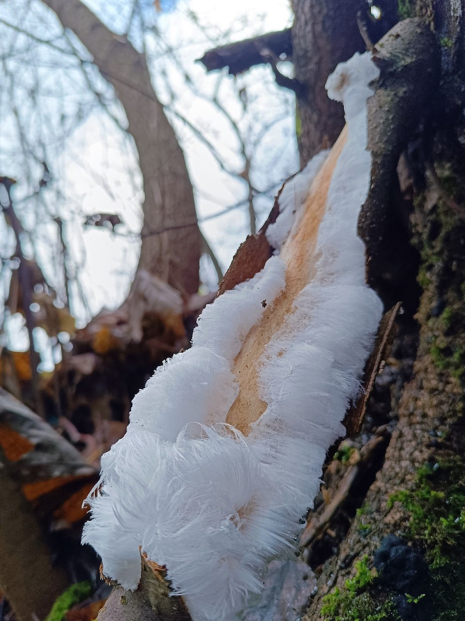 "Ледяные волосы" - тонкие нити льда, которые формируются на гниющей древесине во влажных лесах.