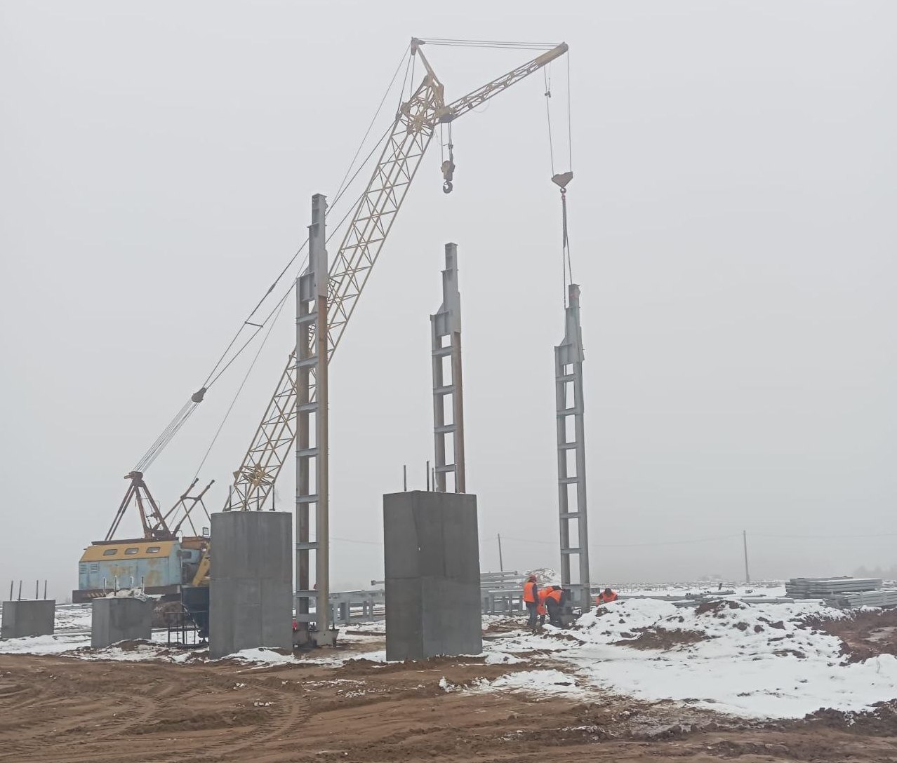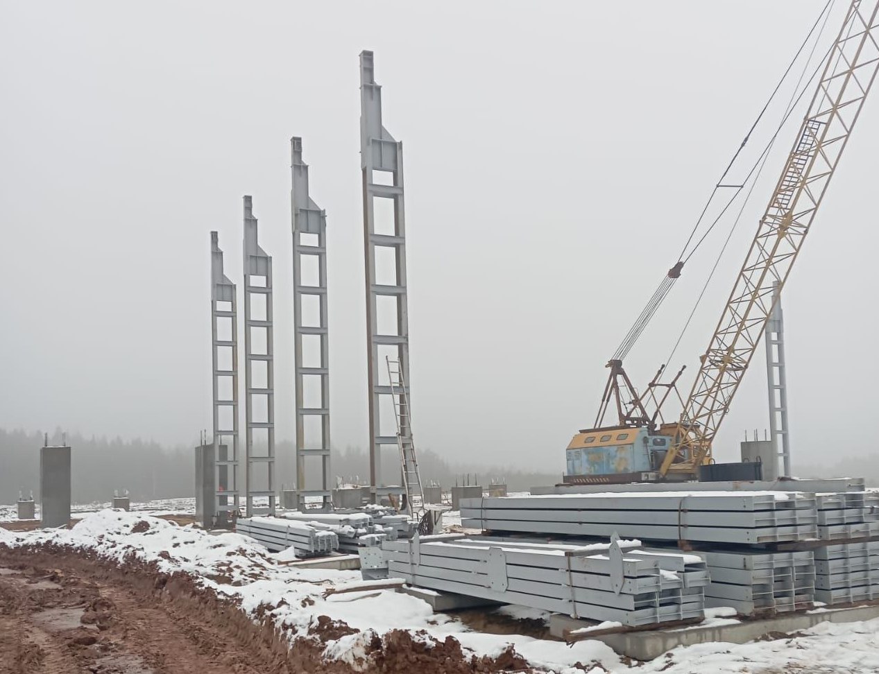 На объекте уже установлены ограждение и трансформаторные подстанции, подведено электричество. Сейчас идет монтаж металлоконструкций стен основного корпуса.