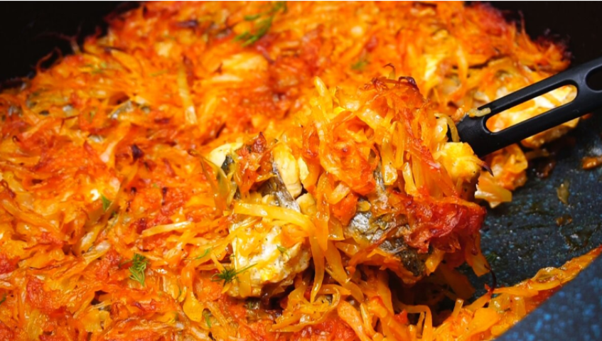 После этого половину капустной смеси выложите на дно формы для запекания, сверху разместите порции рыбы и накройте оставшейся капустой. Поставьте в предварительно разогретую духовку и запекайте при 180 градусах в течение 30 минут. Блюдо готово к подаче, и его богатый вкус никого не оставит равнодушным.