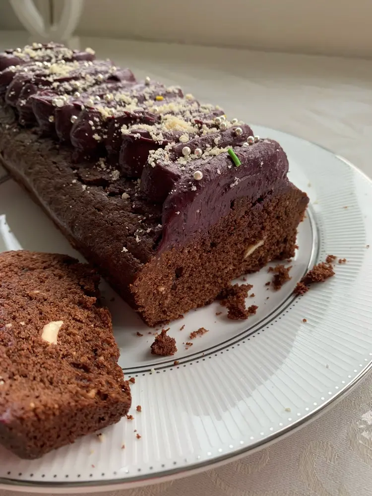 Далее подготовить форму для выпечки, смазав её сливочным маслом. Вылить тесто в форму и отправить в разогретую духовку на 40 минут. Пока кекс выпекается, стоит заняться приготовлением шоколадного крема: растопить оставшийся шоколад на водяной бане, добавить оставшееся масло, сахарную пудру и ванилин. При необходимости, можно добавить немного молока, если крем получился слишком густым.