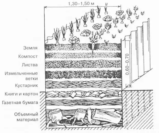 - Заглубленная грядка: Для этого типа потребуется выкопать траншею, в которой будут расположены слои материалов.