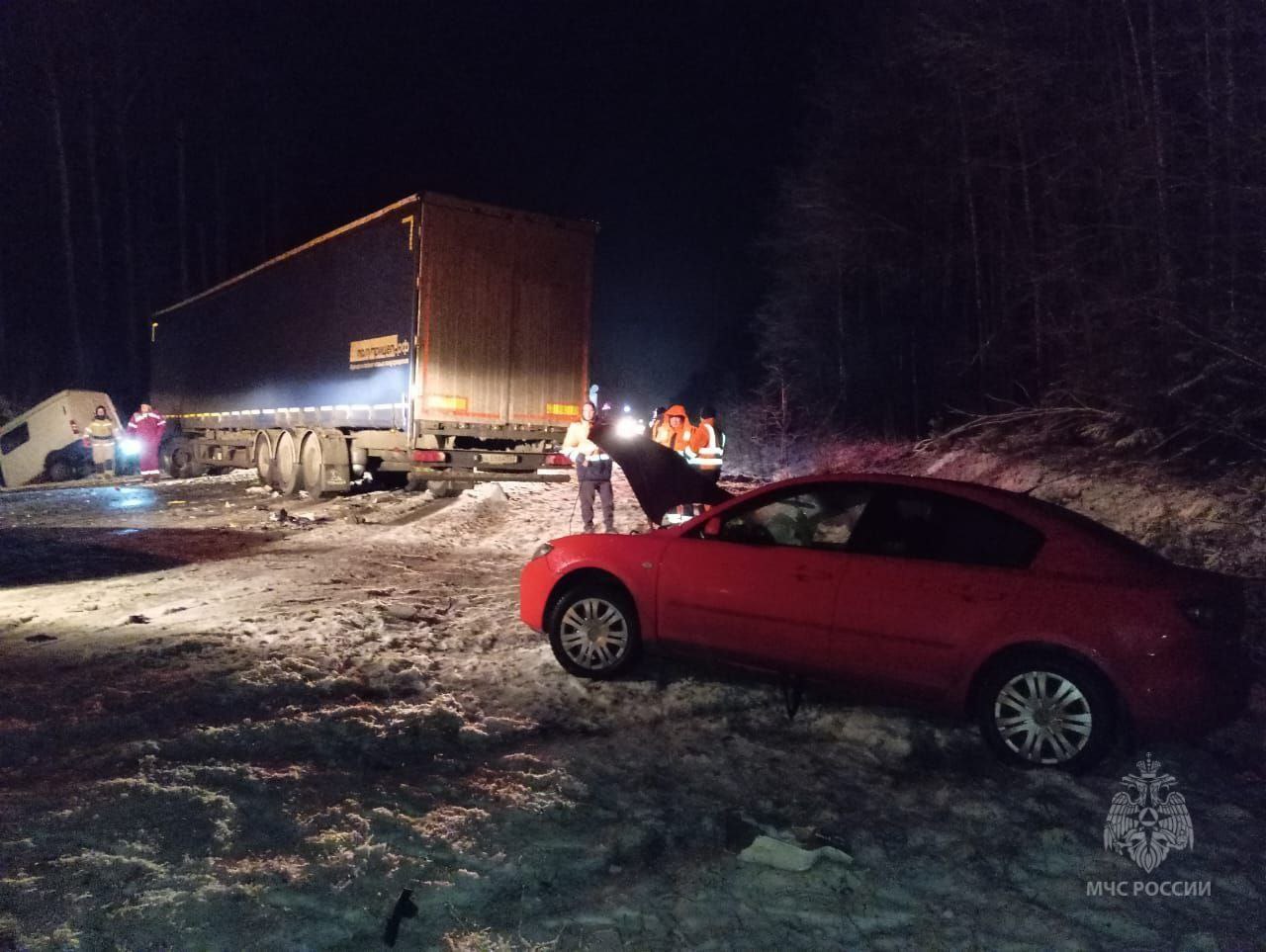Сегодня вечером на 454-м километре автодороги Р-176 «Вятка» столкнулись автомобили «Соболь», «Мазда» и грузовик «Фотон».