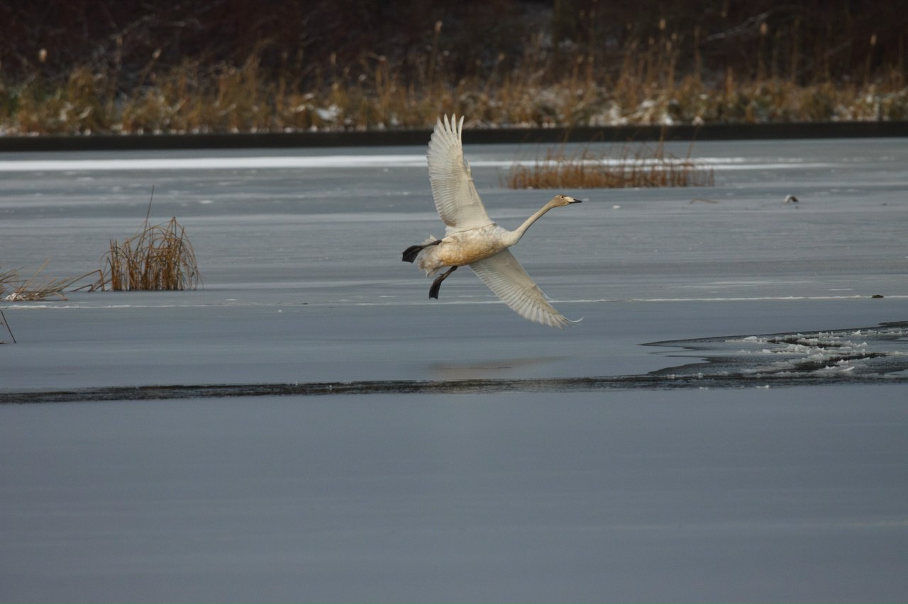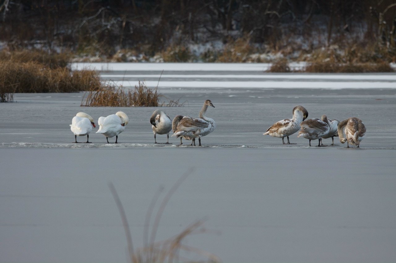 Подготовка к отлёту. Одиннадцать лебедей-шипунов и примкнувший к ним лебедь-кликун на льду Староречья Вятки