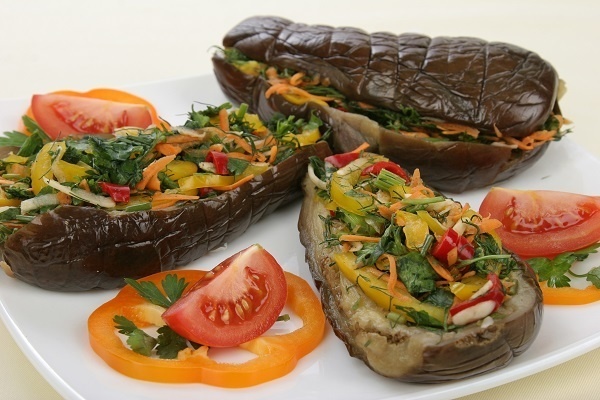 3. Наполнение баклажанов: Каждый баклажан аккуратно наполняется полученной начинкой и завязывается ниткой, чтобы сохранить форму. Начиненные баклажаны выкладываются в эмалированную кастрюлю и заливаются холодной водой с уксусом (на 1 литр воды — по 1 чайной ложке соли и уксусной эссенции). Сверху кладется гнет, и кастрюля оставляется в прохладном месте на ночь.