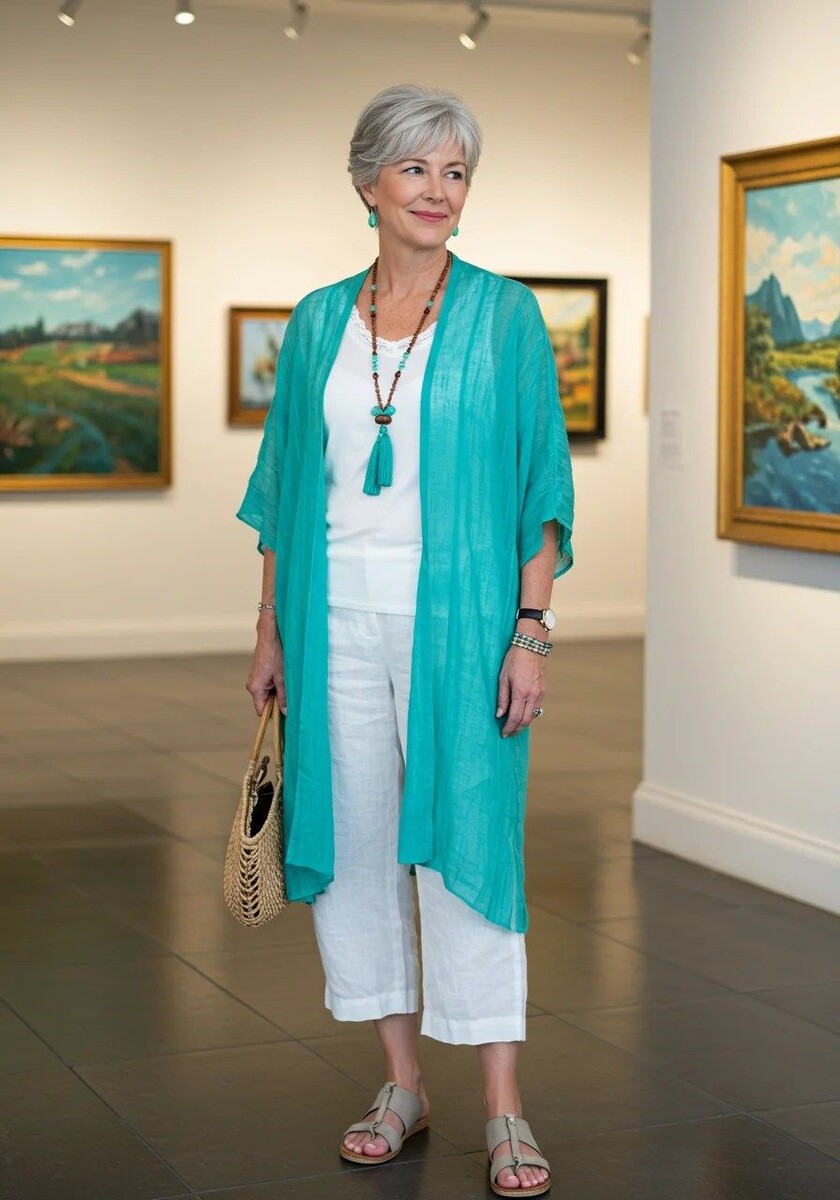 - Белоснежный комплект из укороченных свободных брюк и футболки из натурального материала станет отличным выбором. Добавьте к образу нежно-бирюзовый кардиган и комфортные босоножки на низком ходу. Закончите look плетеной сумкой и стильными аксессуарами — серьгами и браслетами.