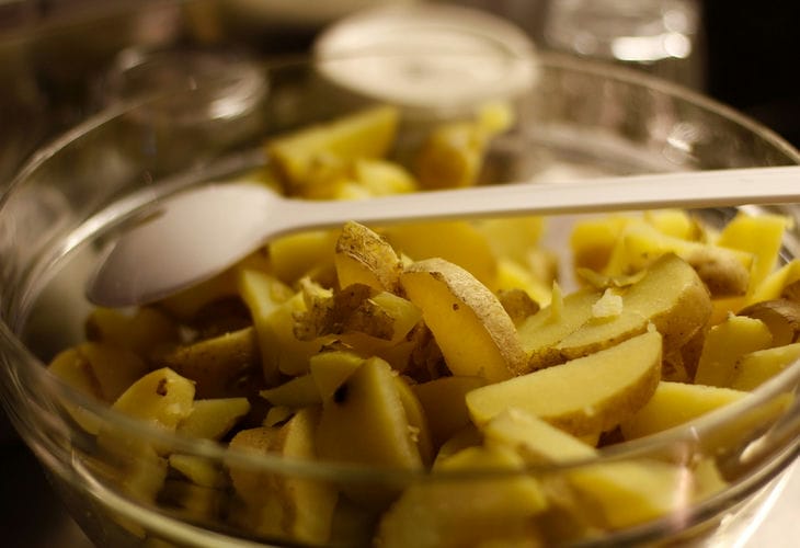 Первым делом необходимо избавиться от излишков крахмала. Для этого нарезанную ломтиками картошку вымочите не менее 5 минут под струей проточной воды.