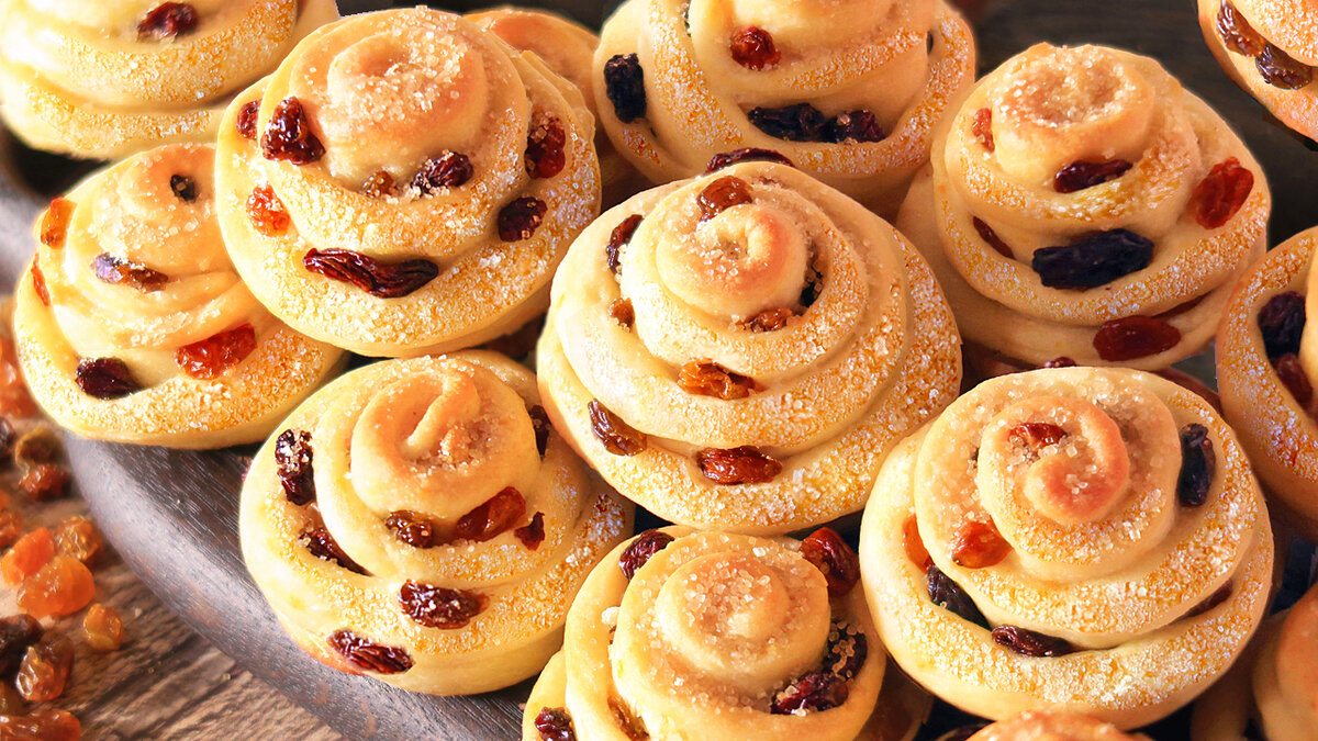 На подготовленный пласт выкладывается предварительно промытый и высушенный изюм, после чего тесто сворачивается в валик. Важно! Сворачивать его нужно не слишком плотно, чтобы сохранить эффект воздушности конечного продукта. Затем полученный валик делится пополам, а головы каждой части слегка загибаются, чтобы создать эффект розочки.