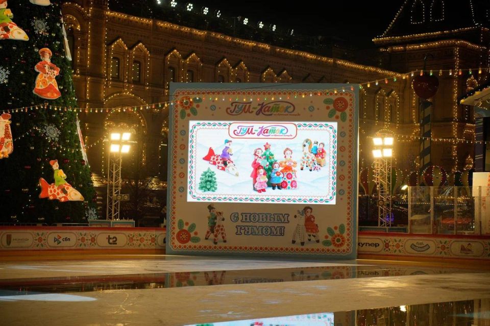 Каток оформлен в стиле дымковской игрушки, как и главный универмаг страны и будет работать с 1 декабря по 1 марта.