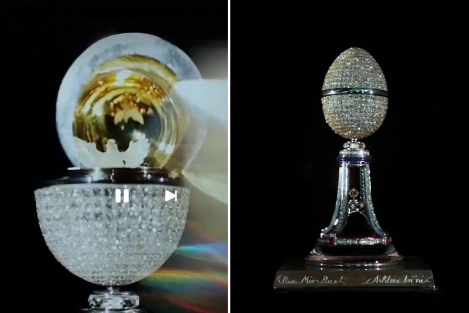 Коронационное яйцо — 24 млн долларов. Создано в 1897 в память о коронации Николая II. Внутри — копия кареты Екатерины I. А узор на скорлупе повторяет роспись мантии государя.