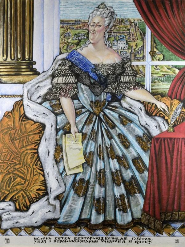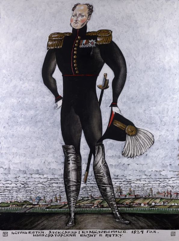 На первой картине изображен Иван Грозный. В руках у Ивана Васильевича свиток, скрепленный большой государственной печатью. В 1577 году, после завершения присоединения Вятских земель к Русскому царству, на печати Ивана Грозного впервые появилась эмблема Вятки. Вторая работа показывает Екатерину II с указом 1780 года о переименовании Хлынова в Вятку. Завершает серию портрет Александра I на берегу реки Вятки во время его визита в 1824 году.
