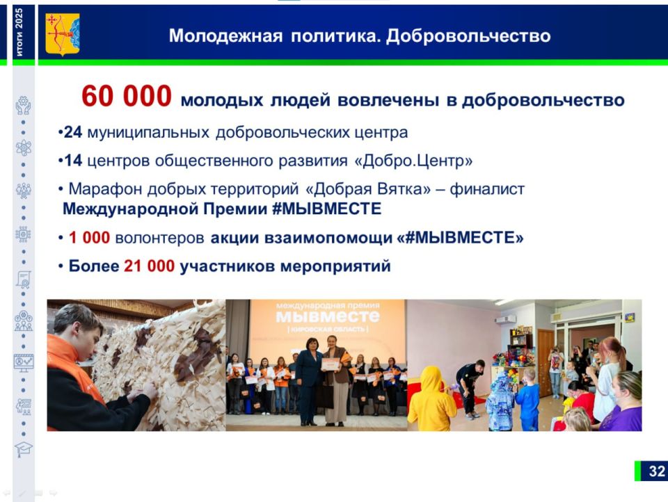 — Особое внимание мы уделяем развитию добровольческой деятельности. В 2025 году в нее вовлечено более 60 000 молодых людей региона. Создаем инфраструктуру: работают региональный ресурсный центр по развитию добровольчества, 24 муниципальных добровольческих центра, 14 центров общественного развития «Добро.Центр».