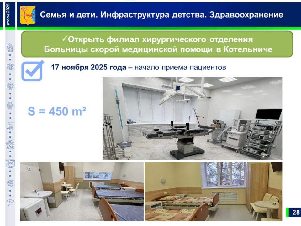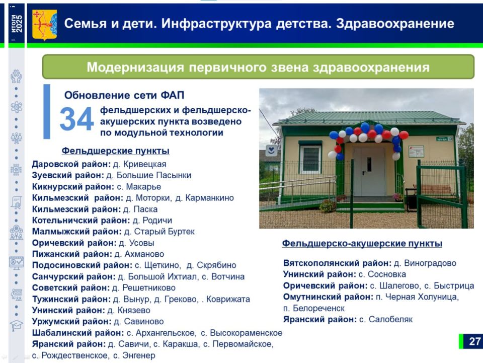 — Завершено строительство детской поликлиники в Слободском. 26 сентября 2025 года получен акт ввода в эксплуатацию, 30 октября — лицензия на медицинскую деятельность.
