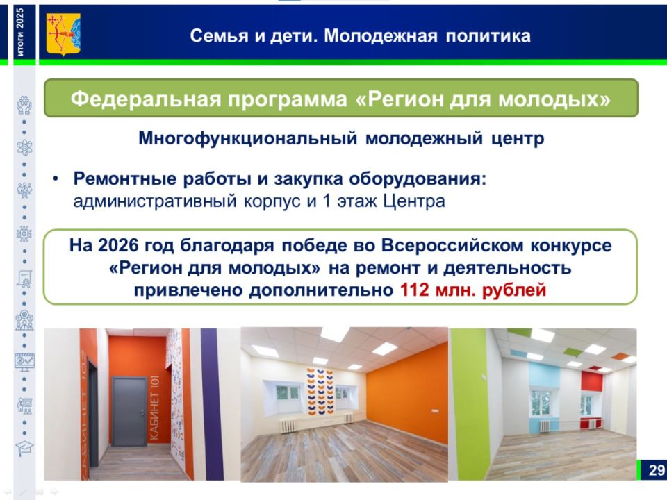 По результатам конкурсного отбора «Регион для молодых» в текущем году в нашу область дополнительно привлечено еще порядка 112 млн рублей. В 2026 году денежные средства поступят для продолжения ремонтных работ центра.