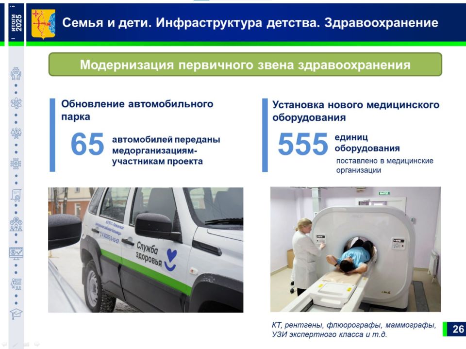 — На 100% выполнены мероприятия по обновлению автопарка медорганизаций и установке нового медицинского оборудования. В медицинские организации региона поставлены 65 автомобилей и 555 единиц оборудования.