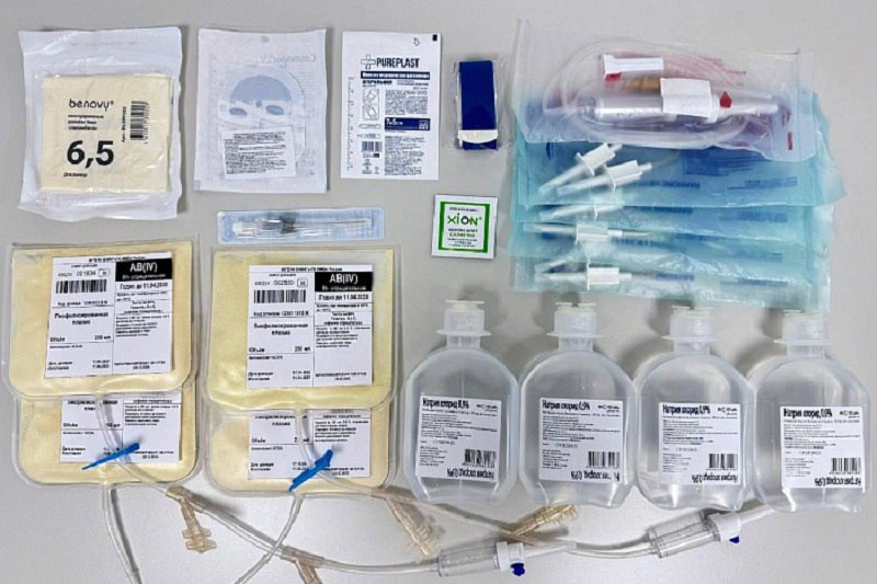 Получившийся комплект содержит лиофилизированную плазму универсальной группы принадлежности АВ, а также все необходимые инструменты для переливания крови.