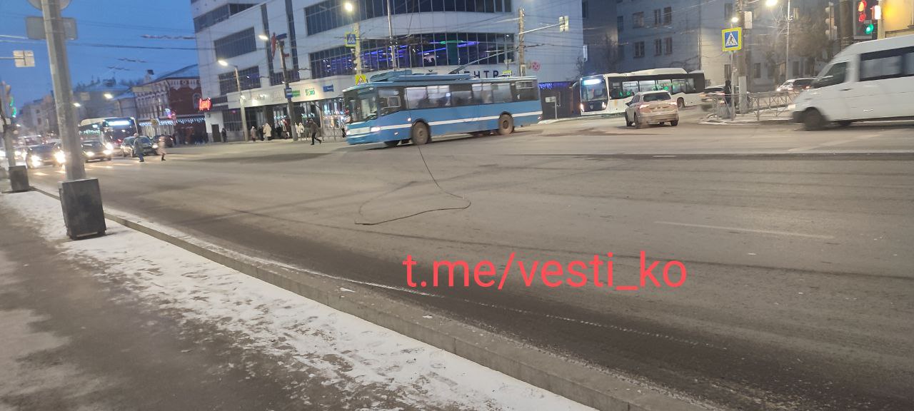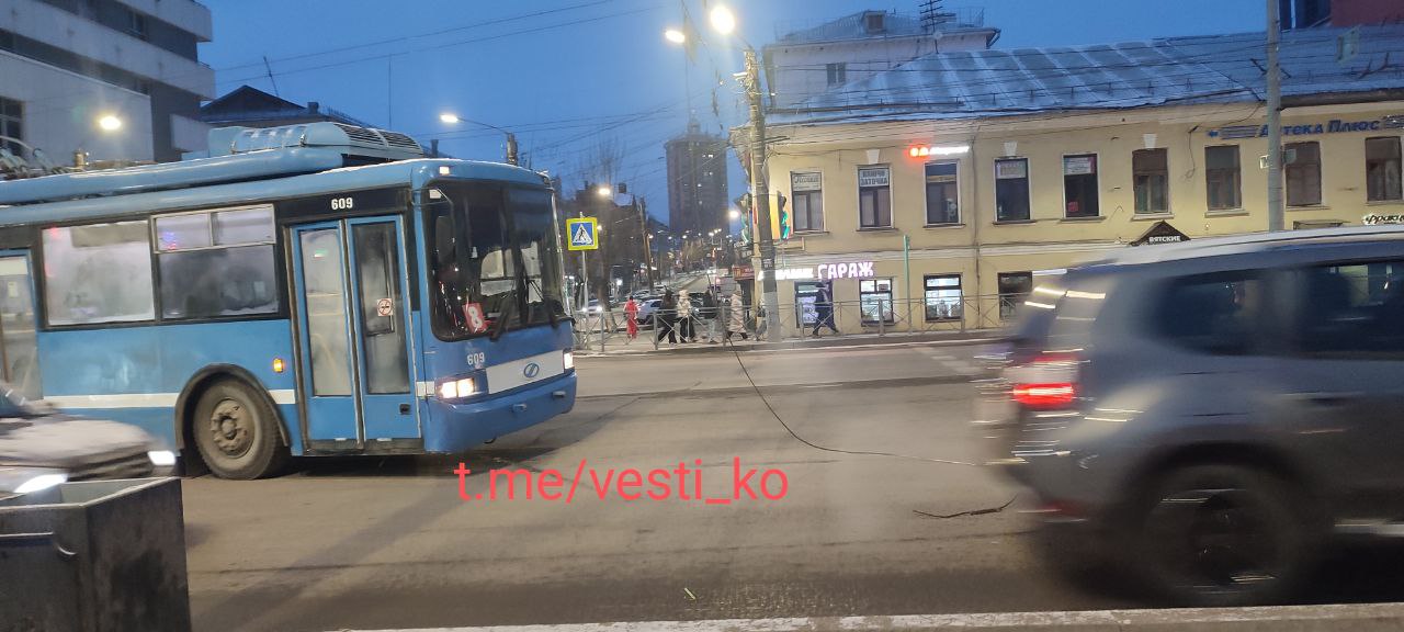 Оборвался провод троллейбусной контактной сети. Предположительно, от обрыва провода пострадал легковой автомобиль.