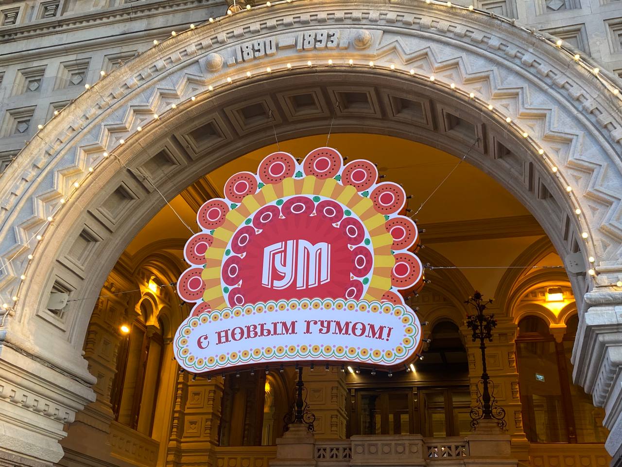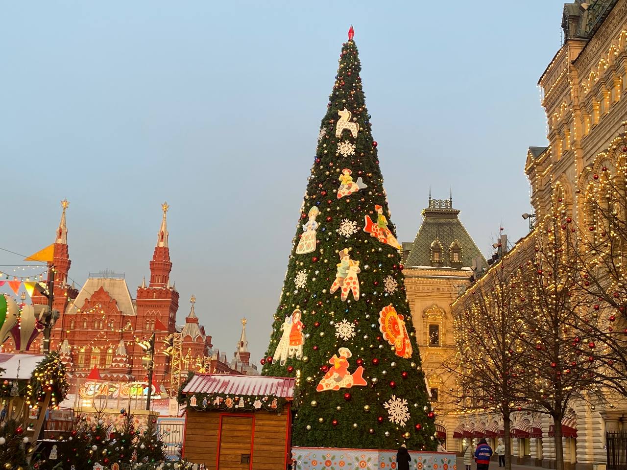 Тысячи огней, гирлянды и декоративные элементы, выполненные в стилистике дымковских узоров, создали на Красной площади неповторимую атмосферу праздника, пропитанную духом русской культуры.