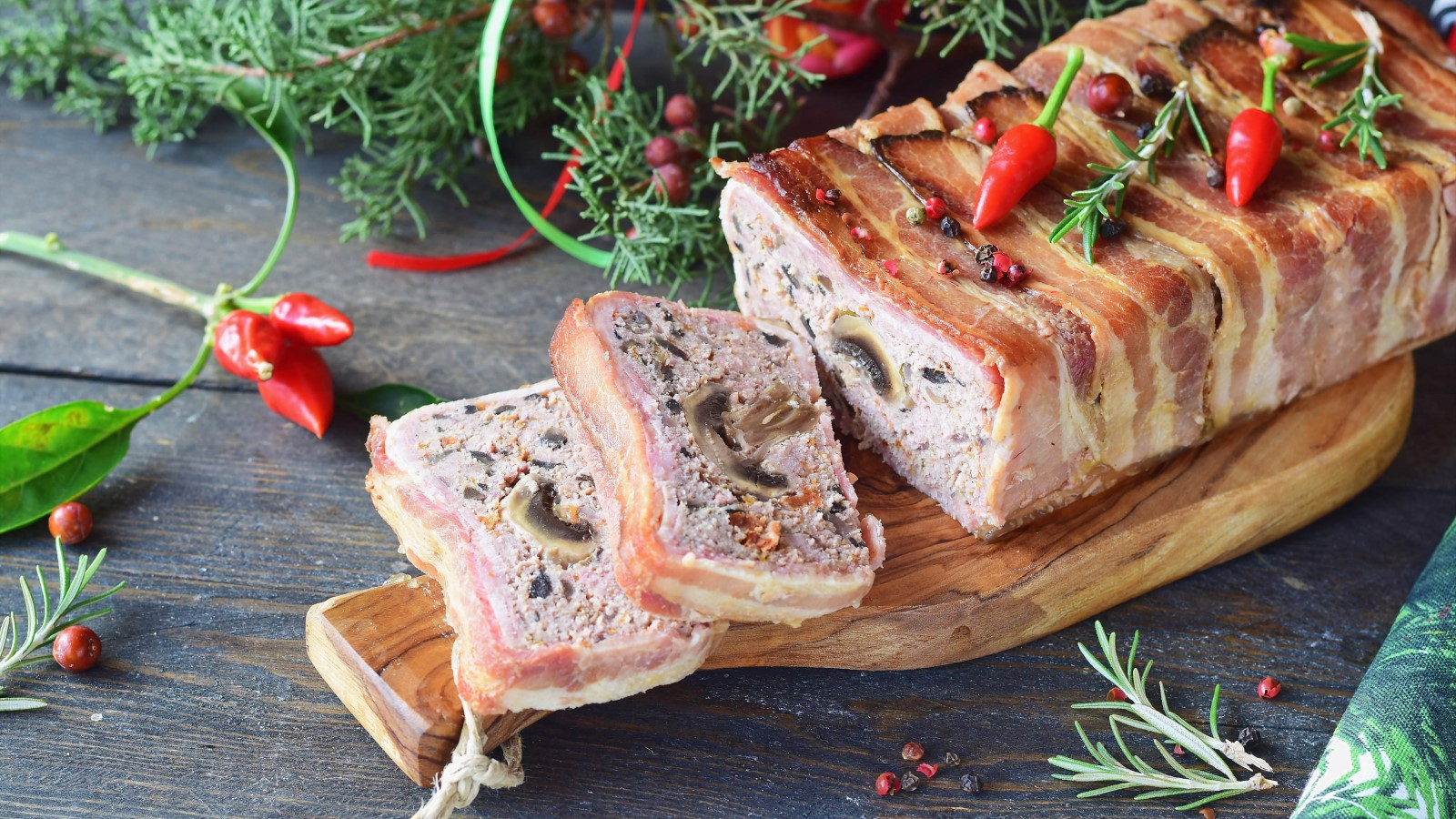 В фарш вбиваем яйца, солим, перчим, приправляем специями и тщательно вымешиваем. Раскладываем мясную смесь на пищевой пленке так, чтобы получился прямоугольник толщиной 1 см. Сверху выкладываем луково-грибную начинку и аккуратно сворачиваем рулет.