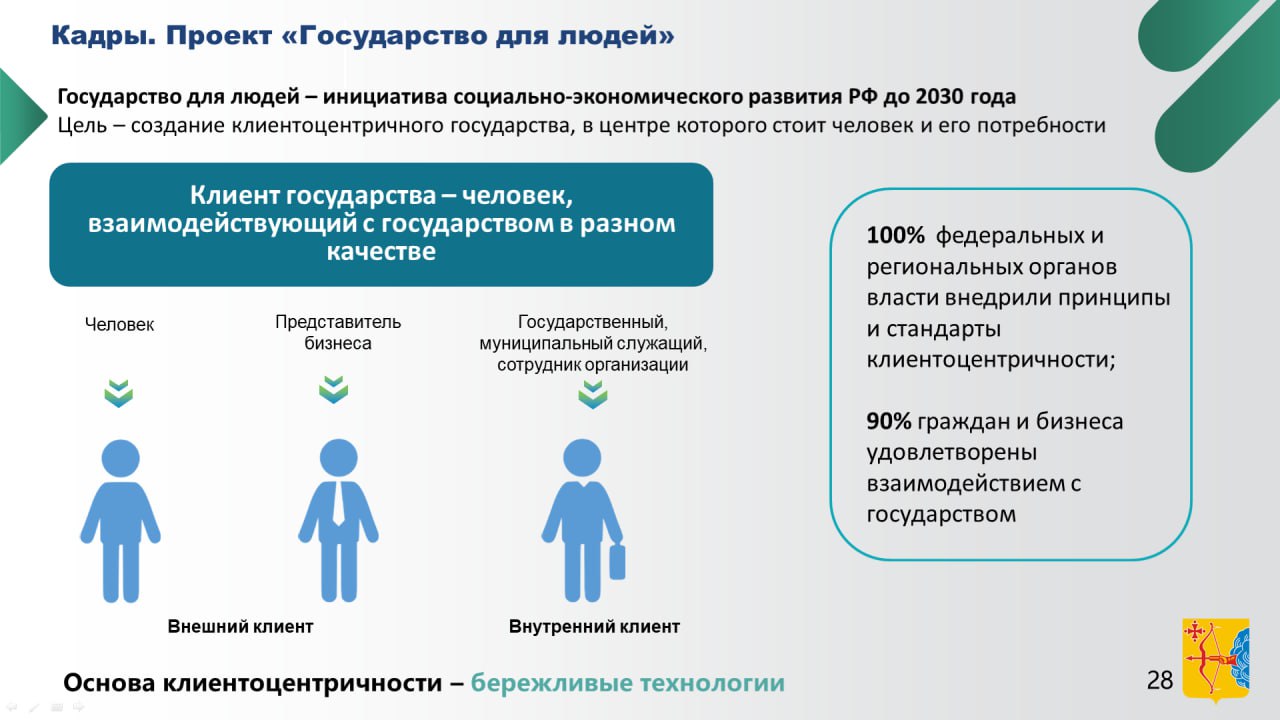 Во-вторых, с 2024 года в Кировской области начата реализация мероприятий федерального проекта «Государство для людей». Ключевое направление — клиентоцентричность как в отношении граждан, так и сотрудников министерств, наших коллег.