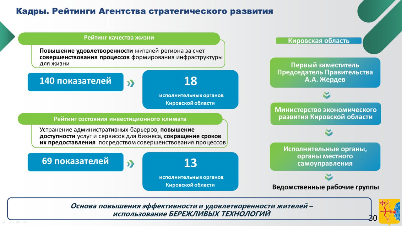 Работа по повышению значений показателей рейтингов в Кировской области проводится каждым органом исполнительной власти под руководством министерства экономического развития Кировской области и кураторством Первого заместителя Правительства Кировской области Алексея Александровича Жердева.