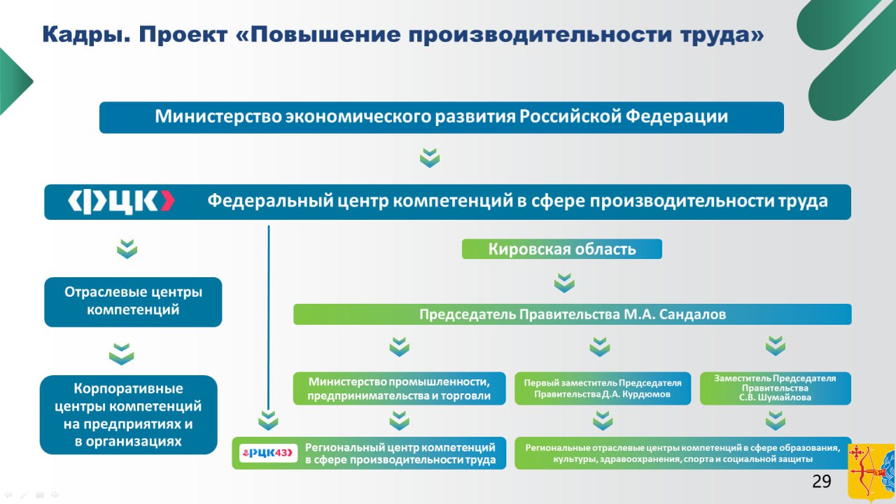 Проектный офис работает в тесной связи с АНО «Региональный центр компетенций Кировской области в сфере производительности труда» координатором которого является министерство промышленности, предпринимательства и торговли Кировской области