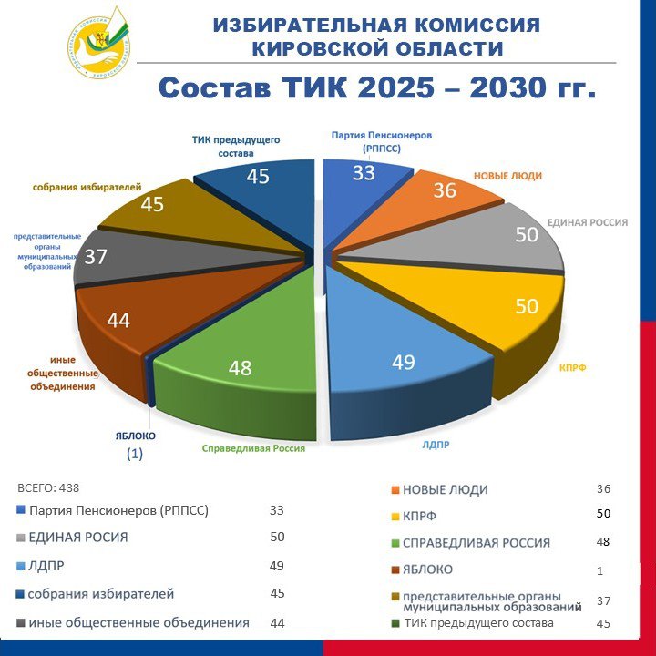 Всего в составы ТИК назначено 438 членов комиссий с правом решающего голоса. Из них 267 или 60,9% от общего числа назначенных - по предложениям 7 политических партий: