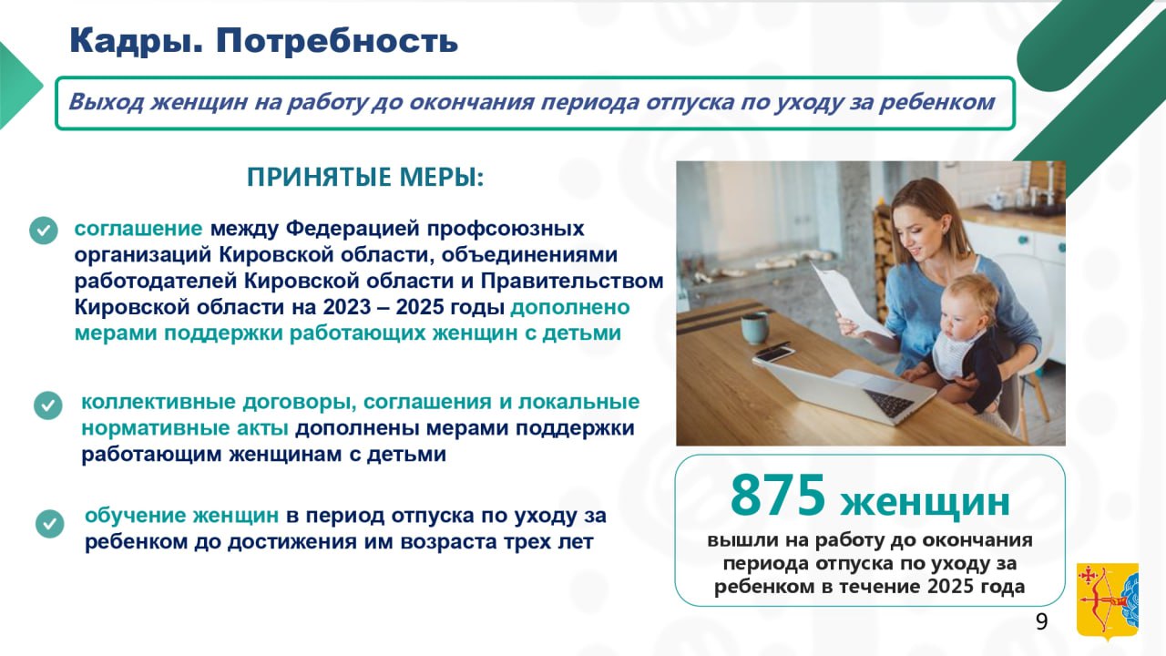 — Продолжаем работу с работодателями по созданию оптимальных условий труда для работающих женщин с детьми. В этом году трудовую деятельность возобновили почти 900 женщин, находящихся в отпуске по уходу за ребенком до 1,5 лет. Прорабатываем вопрос о дополнительных региональных гарантиях для бабушек. Если они оформили отпуск по уходу за ребёнком, а молодая мама вышла на работу.