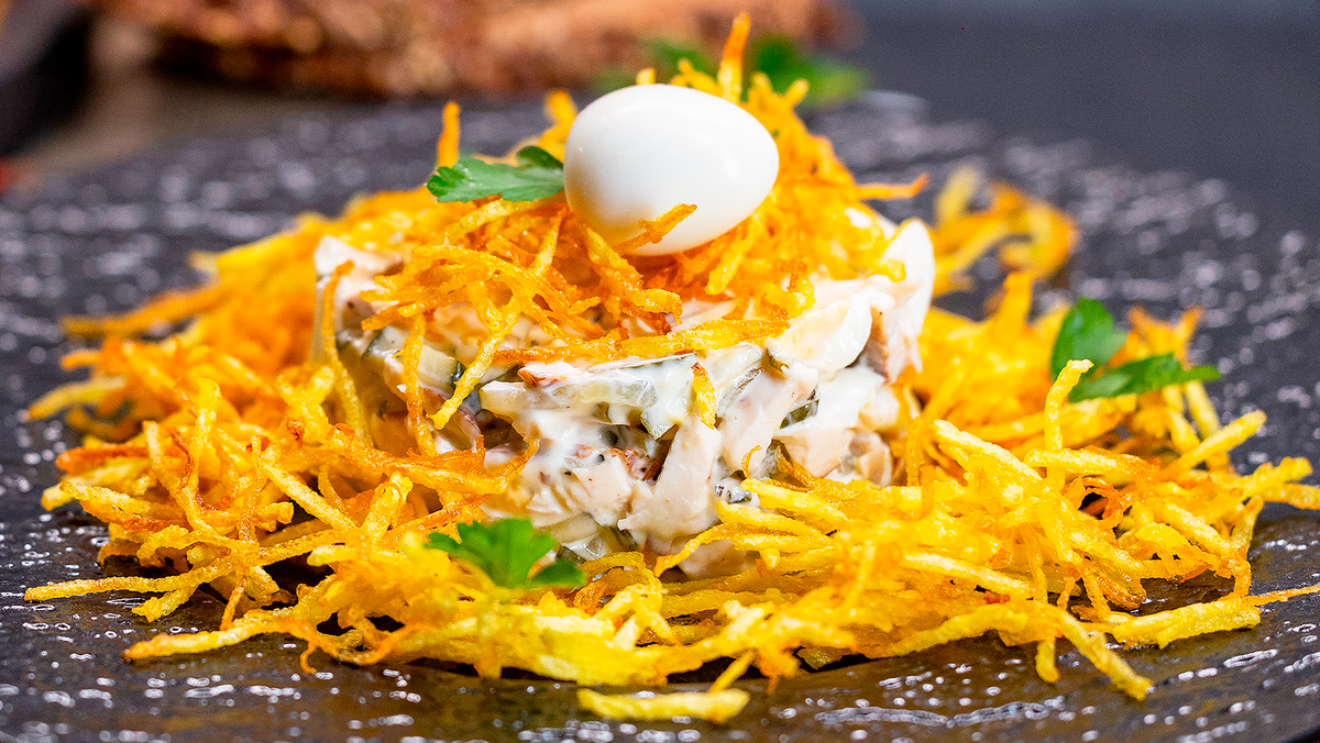 Этот уникальный набор продуктов придаёт блюду ароматы, которые гармонично переплетаются друг с другом. Нежная куриная грудка со своего рода деликатной копченостью, хрустящий картофель, а также пикантные огурцы - все это создает волшебное сочетание на любой праздничной трапезе.