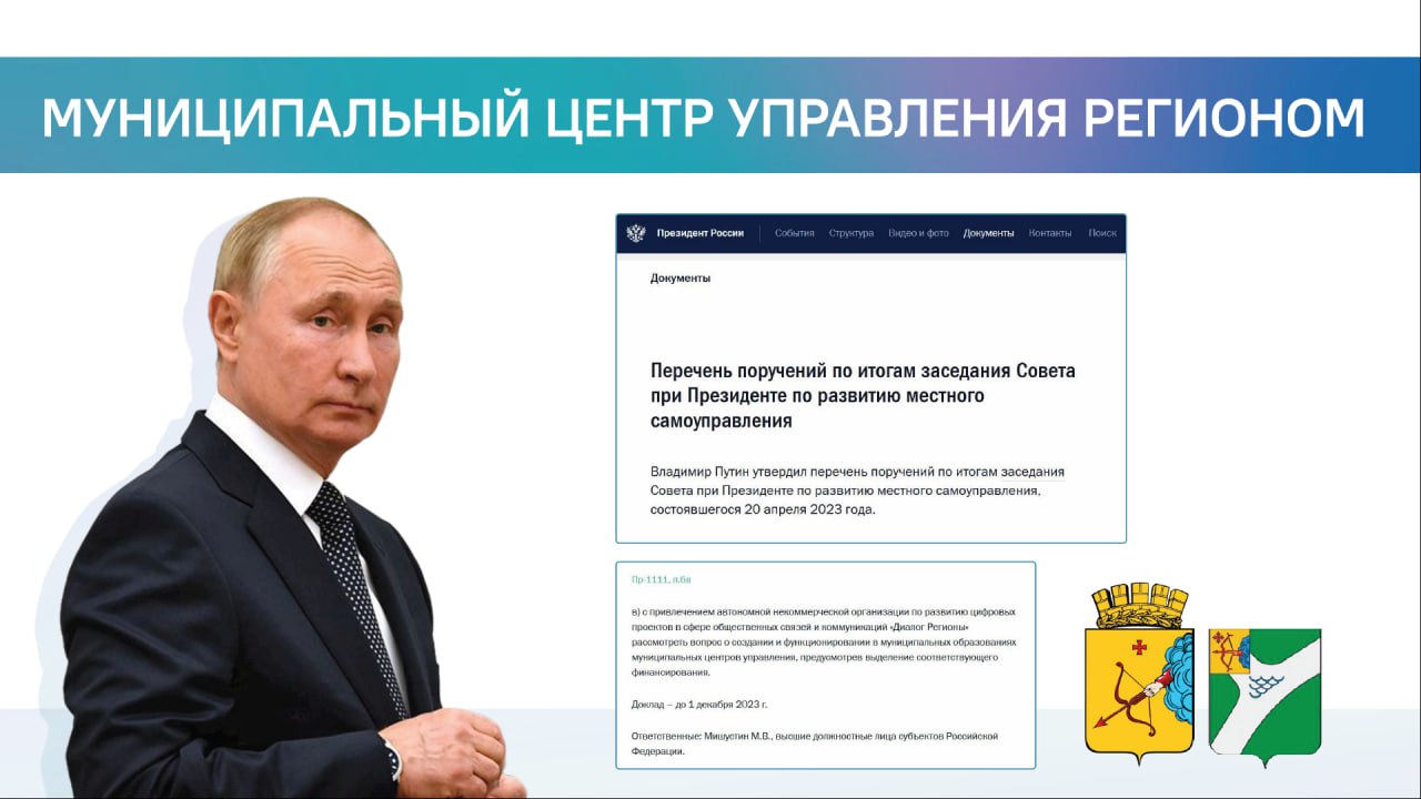 Поручение о внедрении Муниципальных центров управления были даны Президентом по итогам заседания совета при Президенте по развитию местного самоуправления 20.04.2023 года.