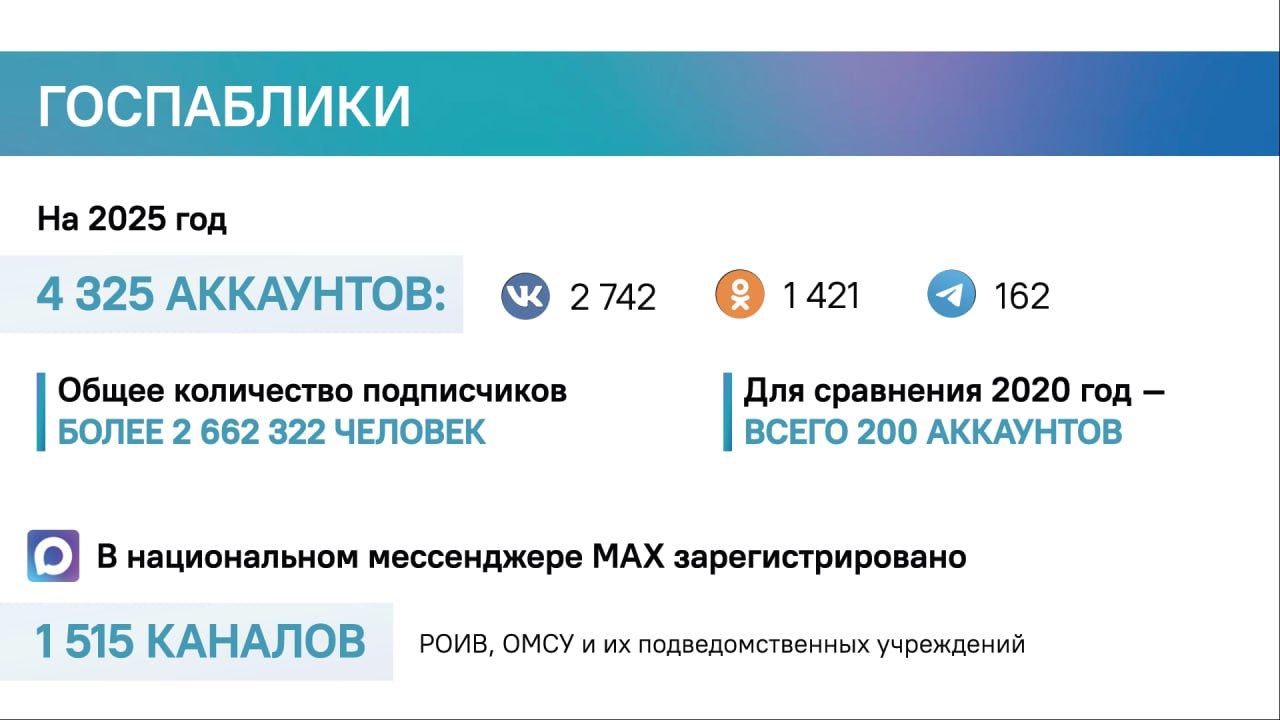 На данный момент создано и верифицировано 4 325 госпабликов с общим количеством 2 662 322 подписчика.