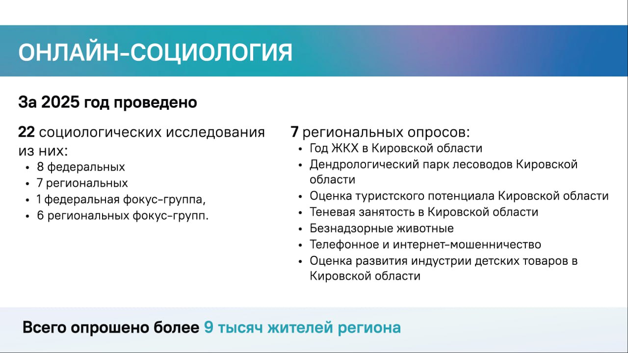 — Для изучения общественного мнения ЦУР по запросам органов власти провел 22 онлайн-исследования, из которых: 8 федеральных; 7 региональных; 1 федеральная фокус-группа; 6 региональных фокус-групп.