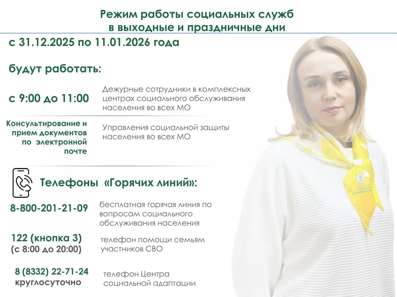 Жители могут направить заявления с указанием своего контактного номера и получить консультацию по электронной почте в управлениях соцзащиты во всех муниципальных образованиях. Адреса электронной почты и номера дежурных телефонов размещены на сайте министерства социального развития Кировской области: https://vk.cc/cSUFGl