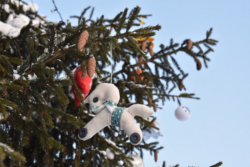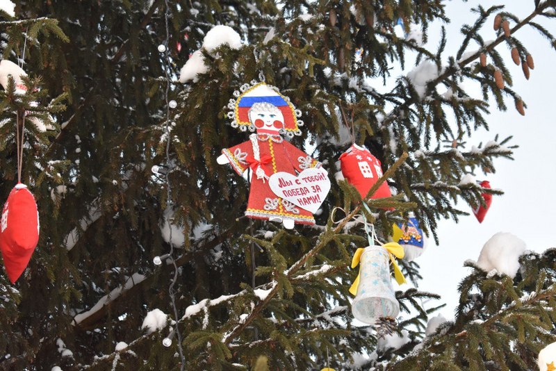 Зелёная красавица украшена игрушками, сделанными жителями города, сотрудниками организаций, студентами, родными бойцов СВО, общественниками.
